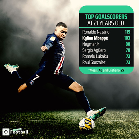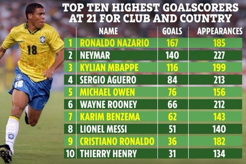 펠레 (18년 1개월, 86경기) > 호나우두 (19년 2개월, 108경기) > 홀란드 (20년 7개월, 123경기) > 음바페 (20년 8개월, 175경기)