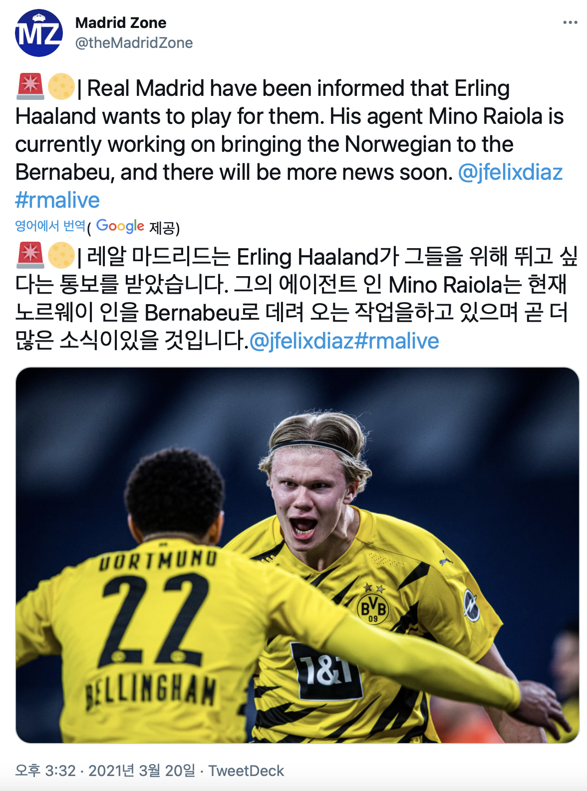 [홀란드는 '레알 마드리드'에서 뛰고 싶어 한다]