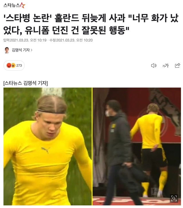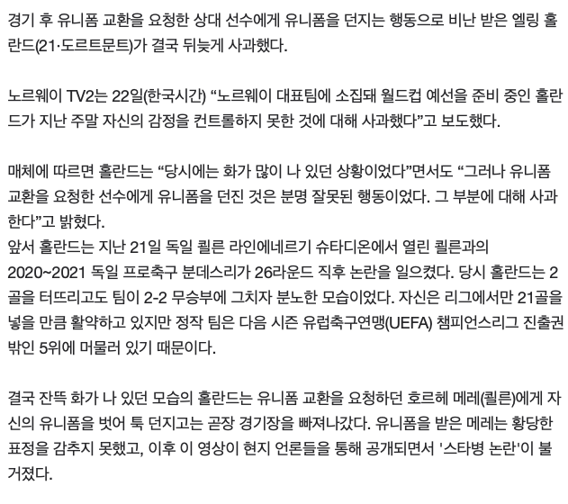 유니폼 던진 행동 사과한 홀란드 "너무 화가 났었다"