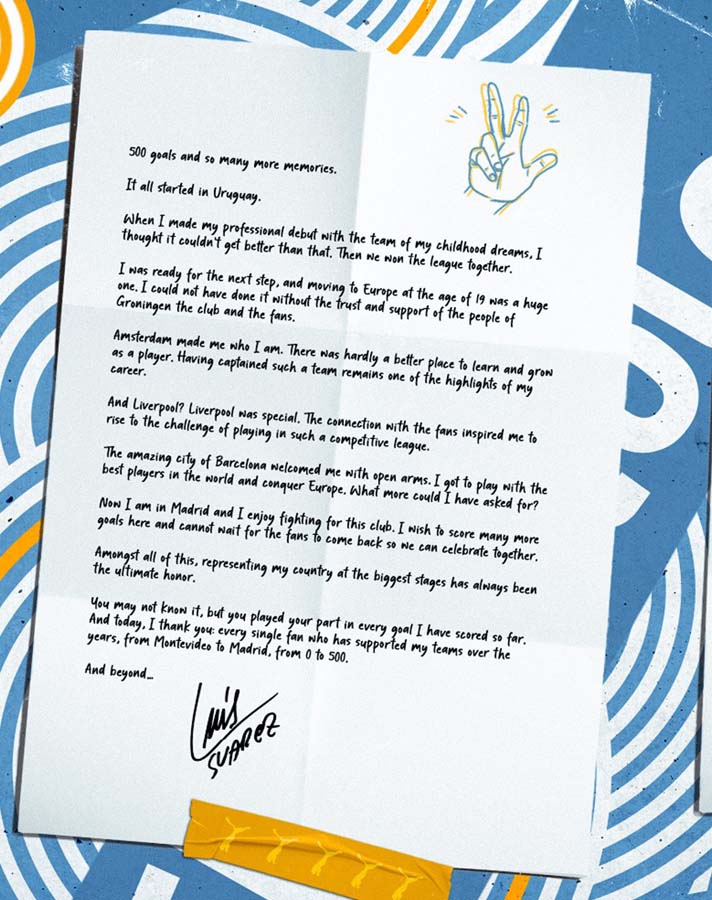 아틀레티코 마드리드의 공격수 ‘루이스 수아레스’는 자신의 커리어 500 득점 기록을 세웠습니다.