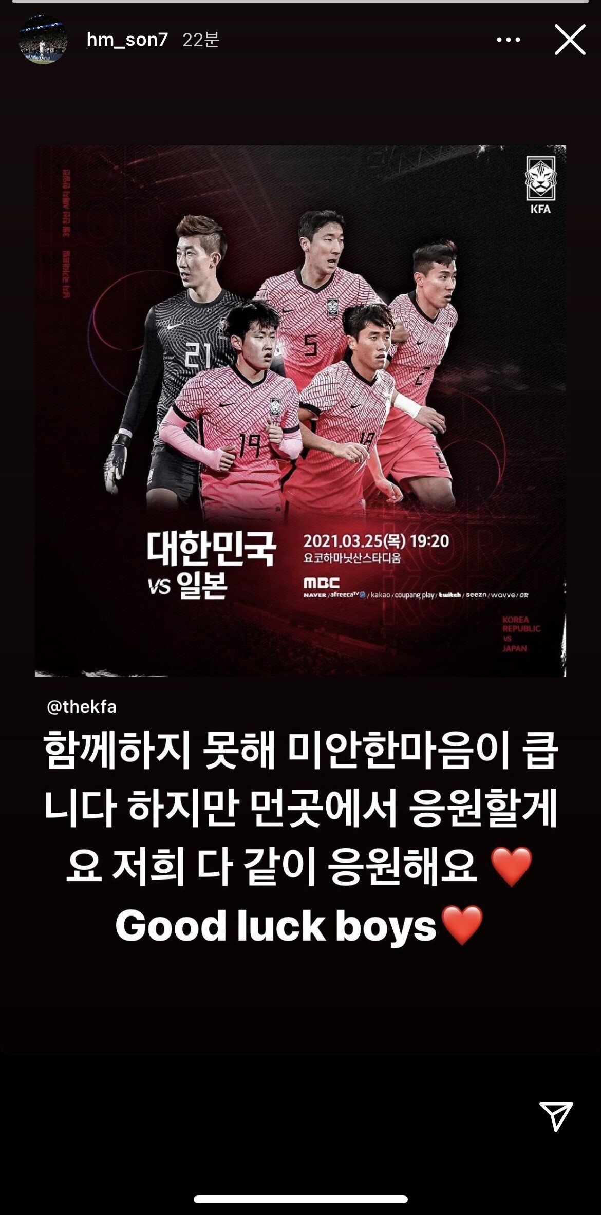 한일전 앞두고, 손흥민의 인스타 스토리