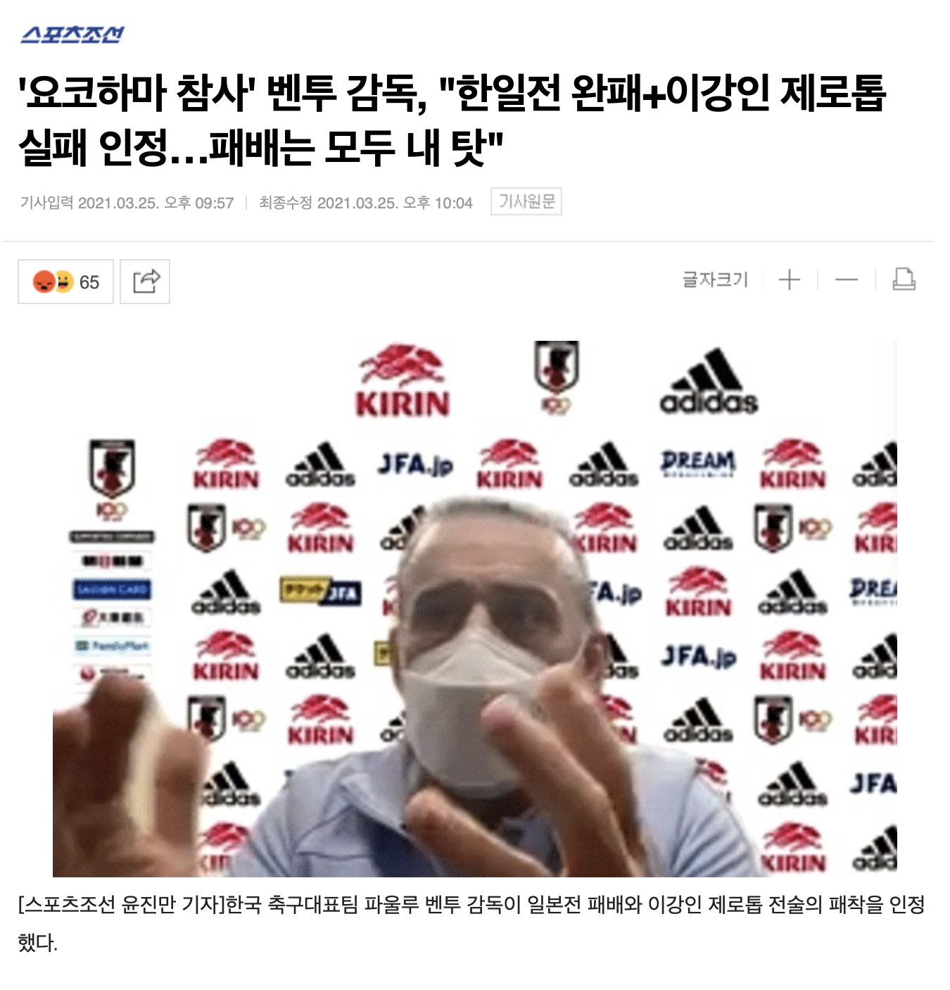 벤투, "이강인 제로톱은 내가 선택한 것.. 실패 인정한다"