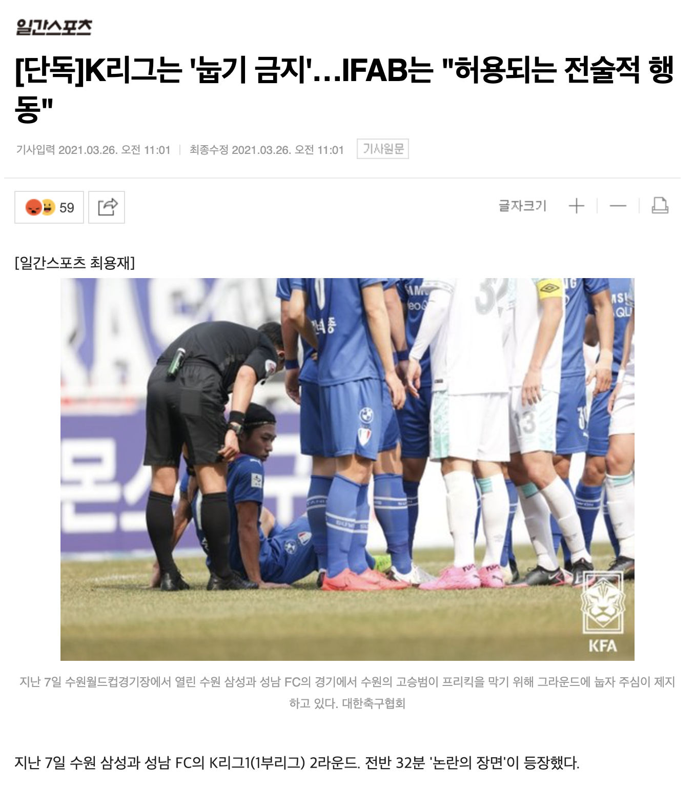 [K리그는 '눕기 금지', 국제축구평의회(IFAB)는 ”허용되는 전술적 행동”]