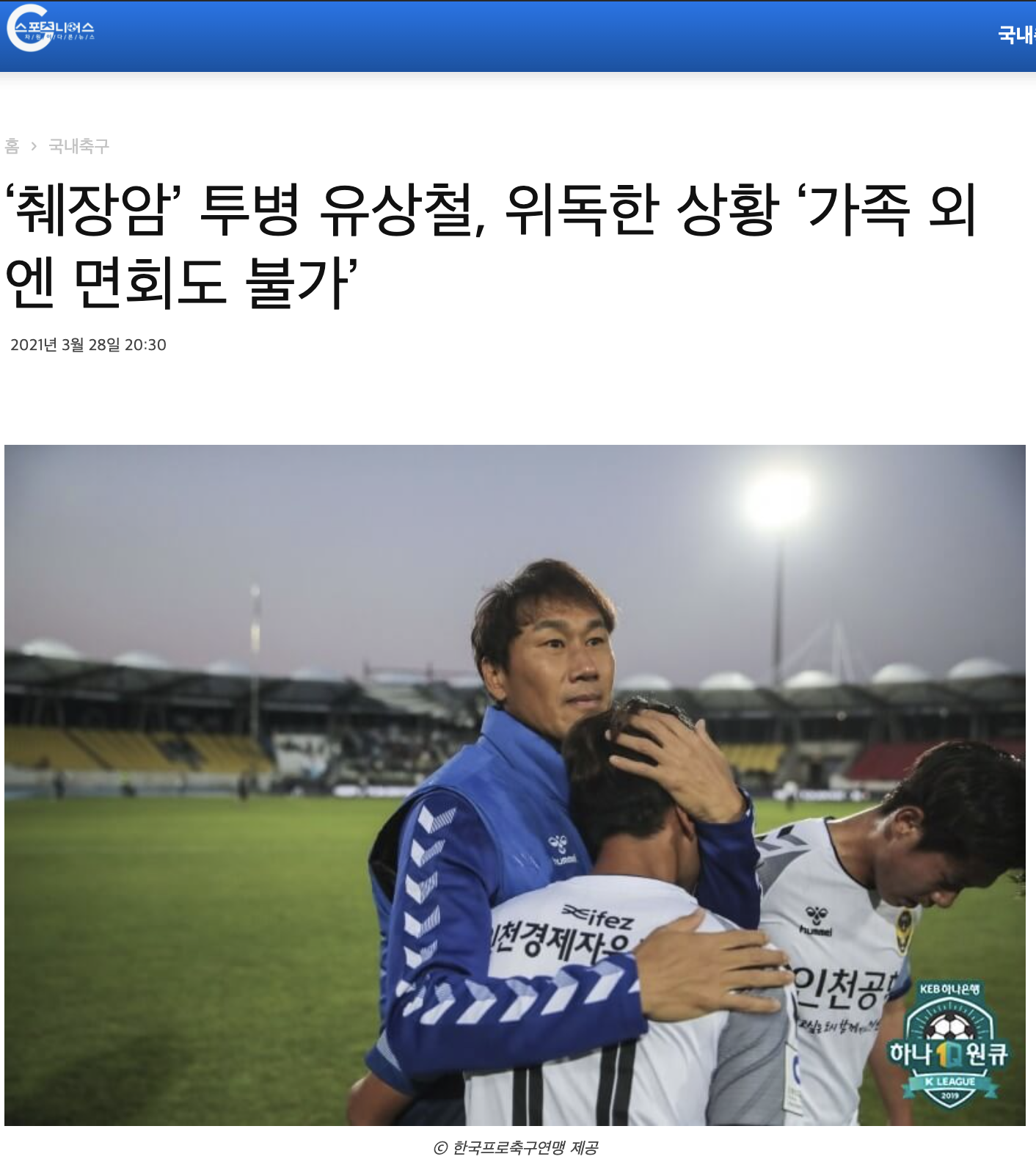 유상철 감독의 지인은 28일 <스포츠니어스>에 “유상철 감독이 사경을 헤매고 있다”면서 “암 세포와 싸우고 있는 그가 고비를 맞았다. 현재 병원에 입원 중인 유상철 감독은 가족 외에는 지인의 면회도 전혀 되질 않는다. 기적이 일어나길 바라고 있지만 쉽지만은 않은 상황이다”라고 전했다.