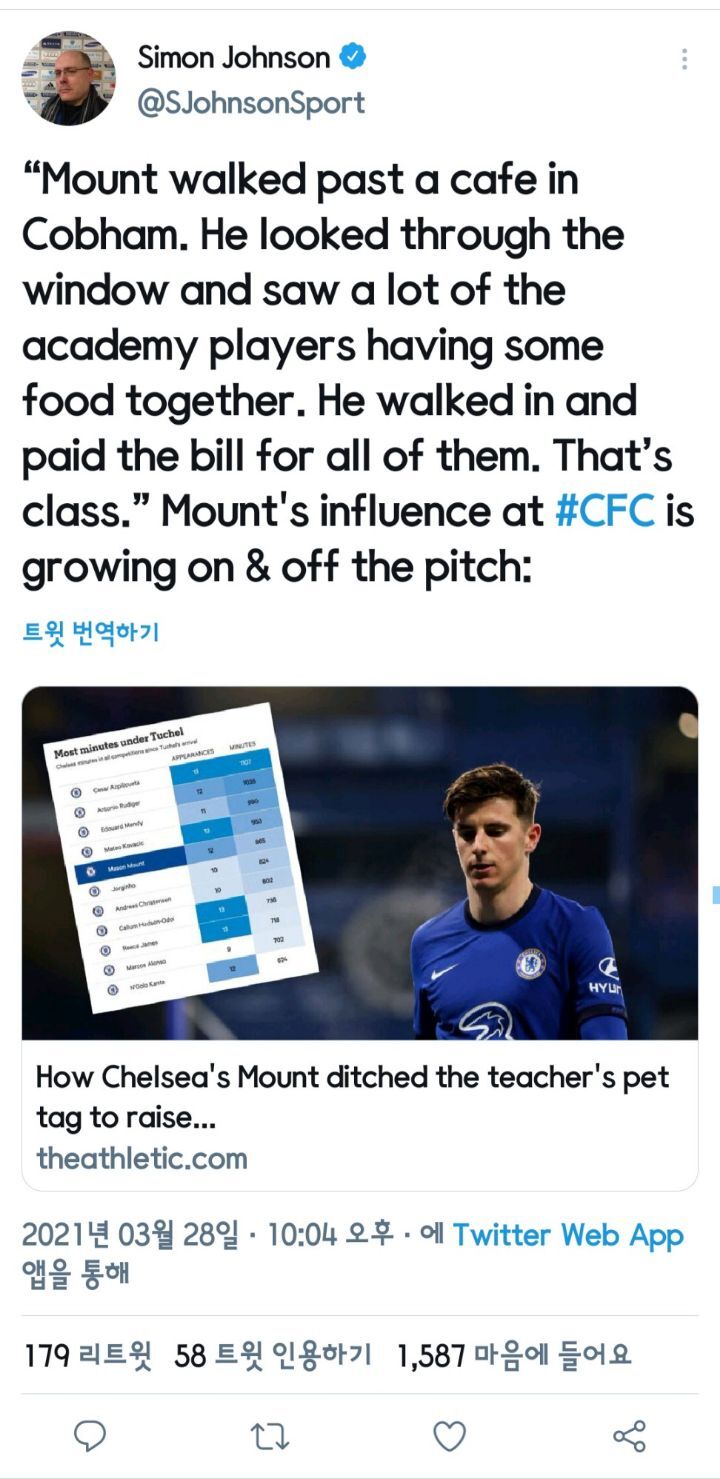 마운트는 코밤 근처의 카페를 지나가다가 창문 너머에 여러 유스 선수들이 밥을 먹고 있는걸 발견했고 들어가서 그들의 밥값을 지불해줬다