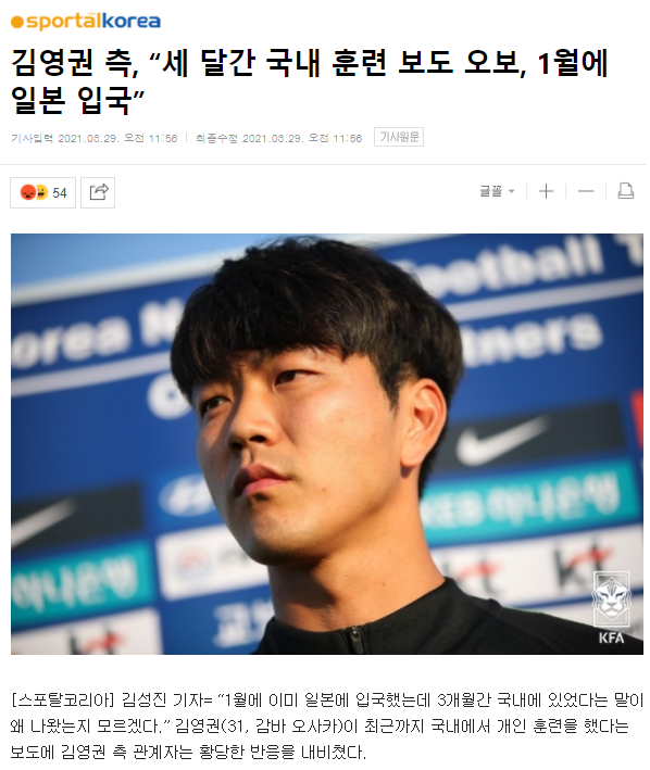 [김영권 측, “2달 동안 팀 훈련을 하지 못했다는 보도는 오보”]