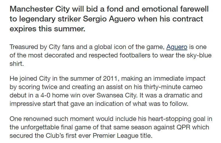 (기사 전문: https://www.mancity.com/news/mens/sergio-aguero-to-leave-manchester-city-63752641 ) |