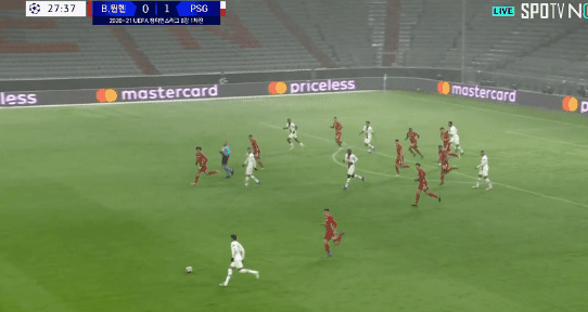 뮌헨 선수들이 페널티 박스에서 빠져나오는 상황에 예상치 못한 뒷공간 크로스를 날리는 네이마르ㄷㄷ