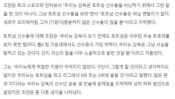 | 크리스털팰리스 전 회장: "토트넘 부진, 무리뉴 탓? 선수 수준과 정신력.." | |