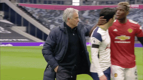 경기가 끝난 후 포그바와 인사하기 위해 기다리고 있었던 손흥민. 둘 은 진한 포옹을 한 뒤 이야기를 나눴고 그 이후 무리뉴가 등장했다