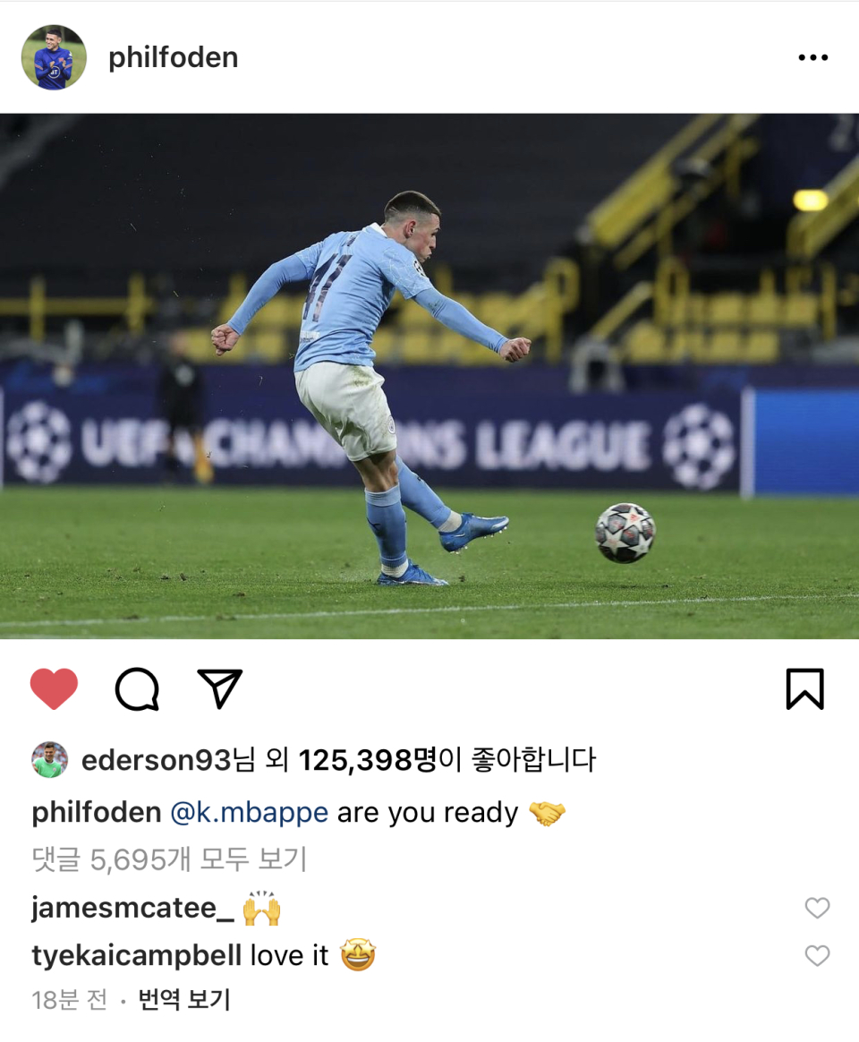 음바페를 도발하는듯한 트위터로 논란이 됐던 필 포든