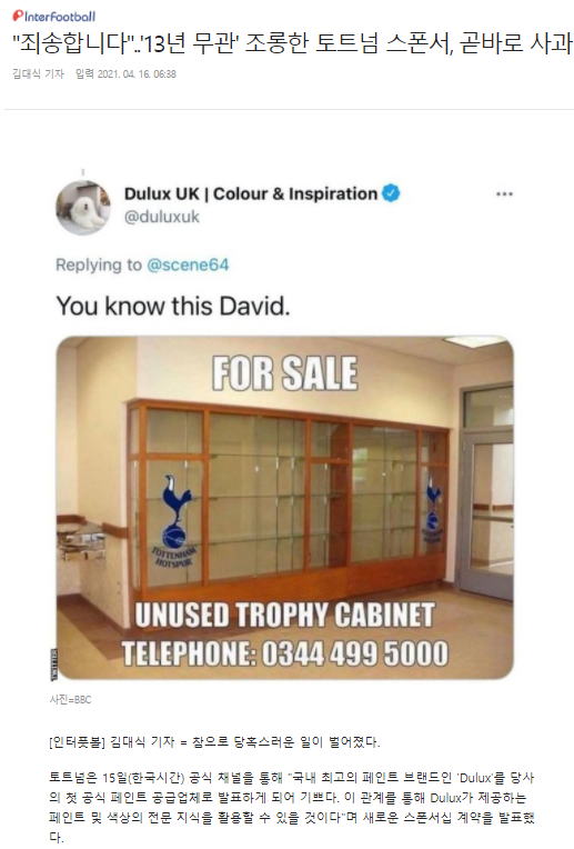 'Dulux'도 트위터를 통해 토트넘과의 협업을 발표했다. 해당 발표를 본 뒤 한 팬이 "다른 것은 넣지 않는 트로피 서랍장에 페인트를 보관할 수 있다"라는 반응을 남겼다. 그런데 'Dulux'의 공식 트위터는 해당 트윗을 본 뒤 토트넘의 로고가 그려져 있고, '사용하지 않는 트로피 서랍장 팝니다'라는 문구가 들어간 사진을 게시해 논란이 됐다.