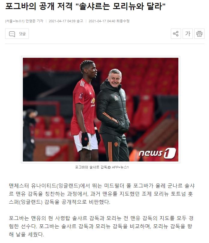 포그바는 17일(이하 한국시간) "솔샤르 감독은 자신이 지도하는 선수들과 충돌하지 않는다"며 "솔샤르 감독도 물론 어떤 선수를 기용하지 않을 수도 있지만, 그렇다고 그 선수가 아예 존재하지 않는 것처럼 대하지는 않는다"고 설명했다. 이어 "이것이 솔샤르 감독과 모리뉴 감독의 차이"라고 덧붙였다.