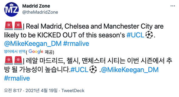 (UEFA는 슈퍼리그에 참가하는 레알, 첼시, 맨시티에게 챔스에서 추방하는 징계를 내릴 가능성이 높다ㄷㄷ 지금은 트윗이 삭제됐네요)