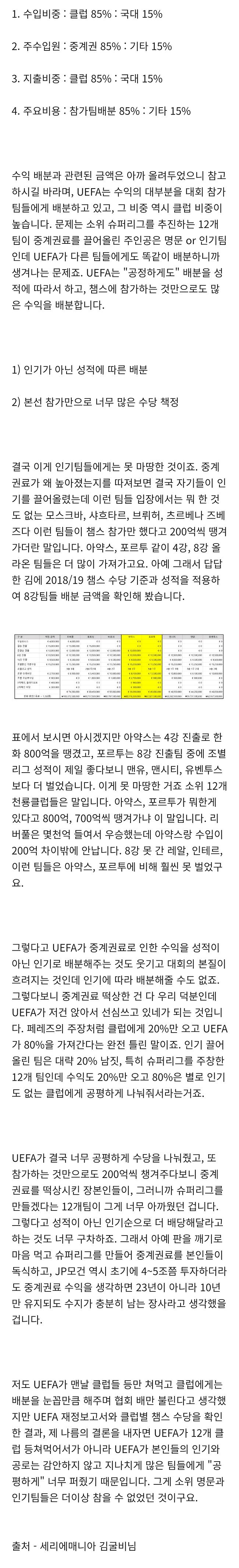 - 빅클럽 : 시청률은 우리가 벌어오는데 왜 성적 순으로 균등배분하냐 - 유에파 : 성적 순 균등분배가 스포츠의 근본취지 아니냐