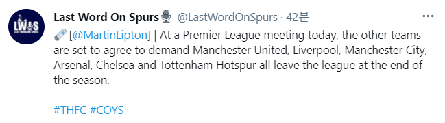 "오늘 프리미어리그 회의에서, 다른 팀들은 맨체스터 유나이티드, 리버풀, 맨체스터 시티, 아스널, 첼시, 토트넘 홋스퍼에 시즌 막바지 리그를 떠나라고 요구하는 것에 대한 합의를 정할 예정이다"