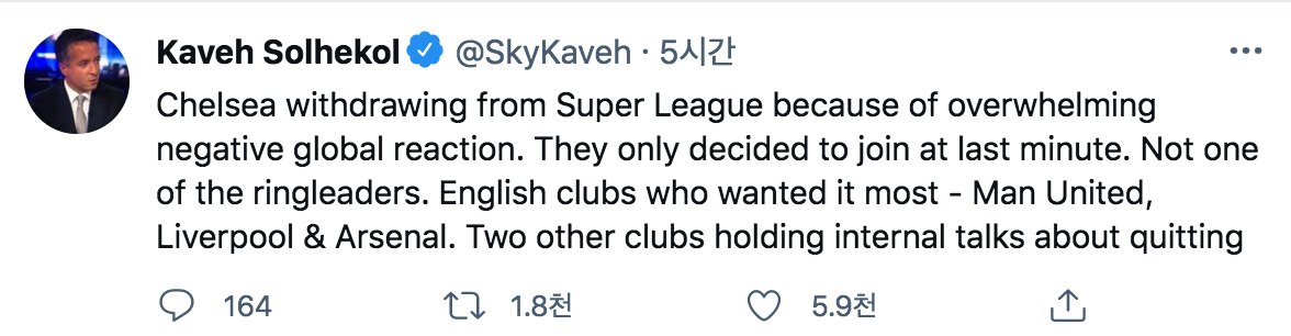 [카베 숄헤콜] 첼시는 압도적으로 부정적인 반응으로 인해 떠났다. 가장 슈퍼리그를 원했던 클럽은 맨유, 리버풀 , 아스날임
