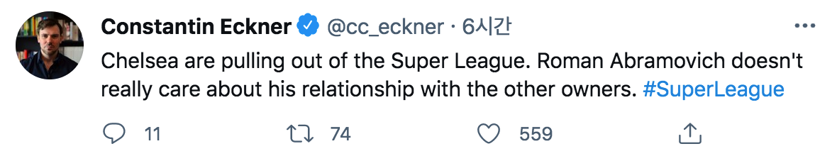 [콘스탄틴 에크너] 첼시는 슈퍼리그 탈퇴한다, 구단주 로만은 오직 첼시를 위해서라면 다른 구단과의 관계는 별로 신경 쓰지 않는다