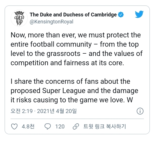 '왕실 서열 3위' 윌리엄 왕세손 (FA 회장) : 슈퍼리그 반대 성명 발표