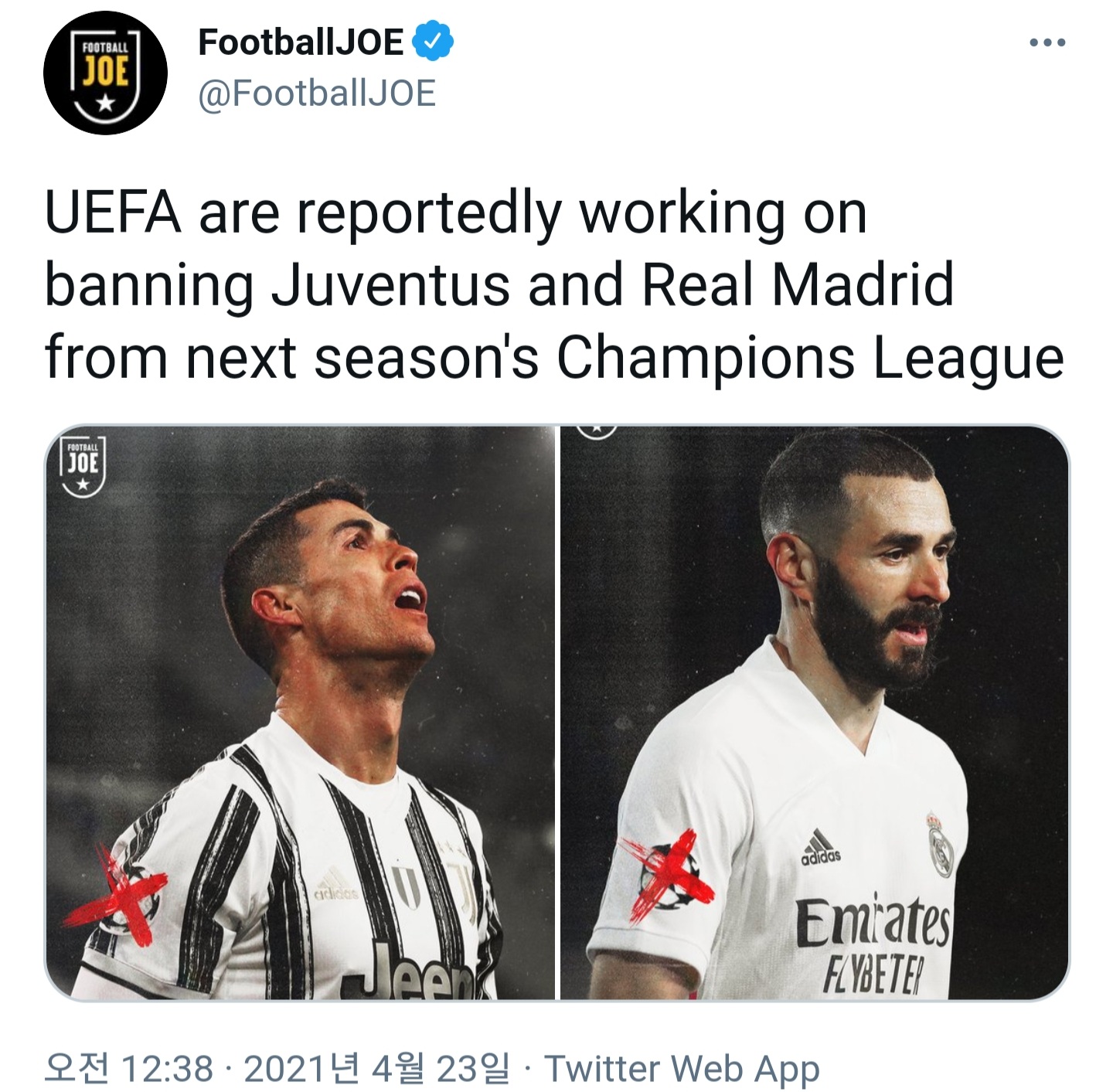 "UEFA는 레알 마드리드와 유벤투스의 다음 시즌 챔스 진출을 금지 시키는 것을 고려하고 있다."