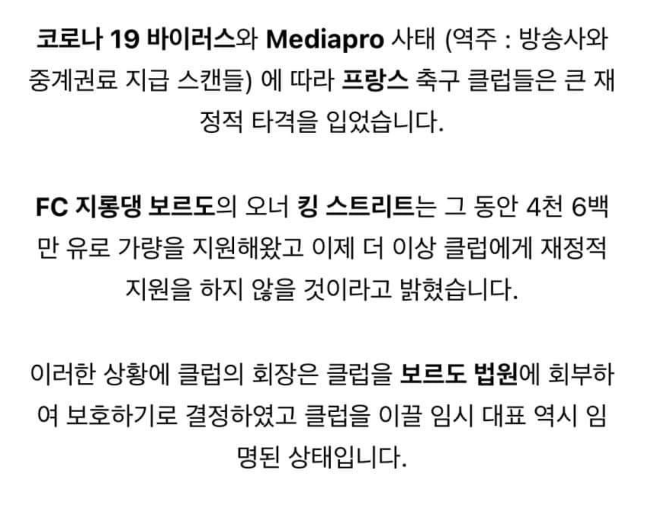 [오피셜]보르도 코로나 재정 위기로 파산