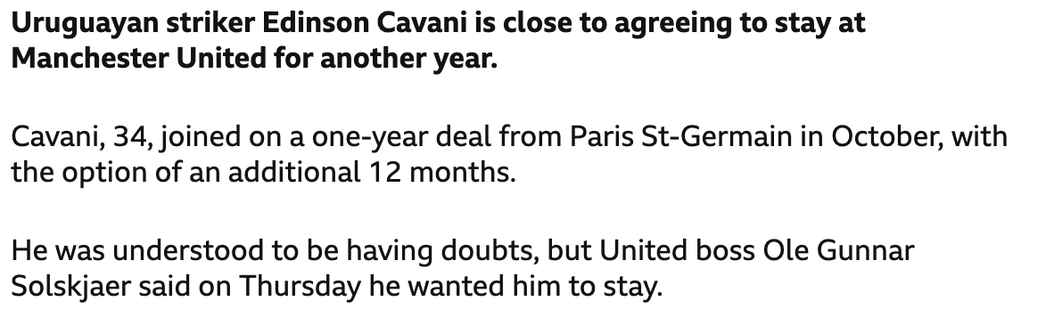 우루과이 스트라이커 에딘손 카바니는 맨유와 1년 연장 계약에 가깝다. BBC 스포츠는 카바니가 솔샤르 감독의 제안을 받아들였으며, 이제 맨유에 잔류할 것으로 파악했다.