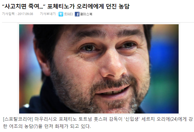 이런 ‘문제아’ 오리에를 포체티노 감독은 어떻게 장악할 수 있을까. 포체티노 감독은 7일(한국시간) 영국 '스카이스포츠'와의 인터뷰를 통해 “(만약 그가 문제를 일으킨다면) 그를 죽여버릴 것이다. 박치기를 할거다”라며 농담 섞인 답변을 내놓았다.