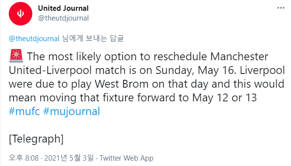 [텔레그래프] 가능성이 높은 맨유 vs 리버풀 경기가 5월 16일 열린다면 리버풀과 웨스트 브로미치의 경기는 5월 12일 혹은 13일로 앞당겨진다는 것을 의미한다.
