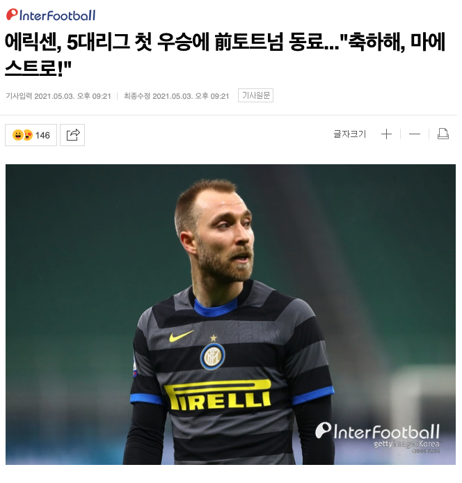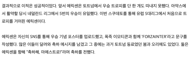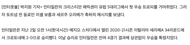 토트넘 떠난 에릭센, 5대 리그 '첫 우승 트로피 획득'
