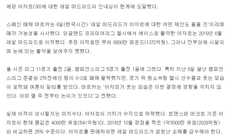 [인내심 폭발한 레알 마드리드, 아자르 매각 준비]
