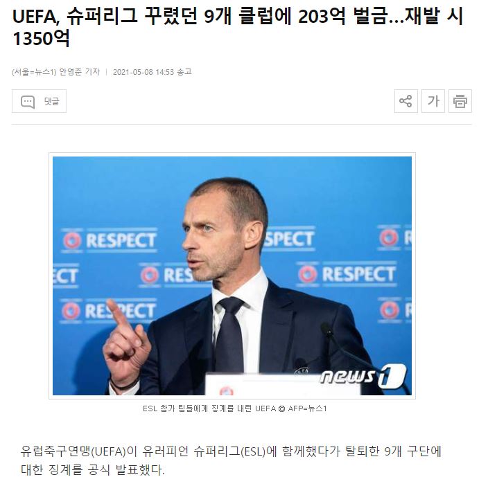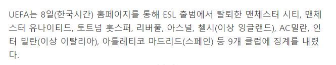 [UEFA, 슈퍼리그 꾸렸던 9개 클럽에 203억 벌금]