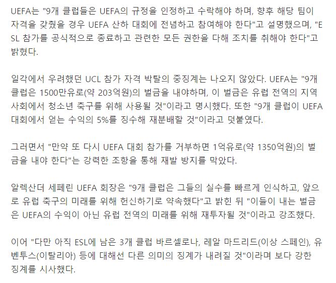 UEFA, 슈퍼리그 꾸렸던 9개 클럽에 203억 벌금