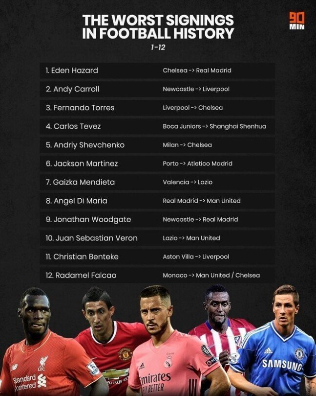 90MIN 선정 역대 최악의 영입으로 뽑힌 아자르.. 꼭 있어야할 선수인데 순위에 없는 선수는 누가 있을까요?