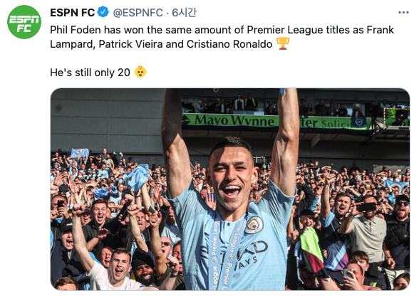 포덴은 램파드, 호날두, 비에이라와 프리미어리그 우승 횟수가 같아졌다. 그는 아직 20살이다ㄷㄷ