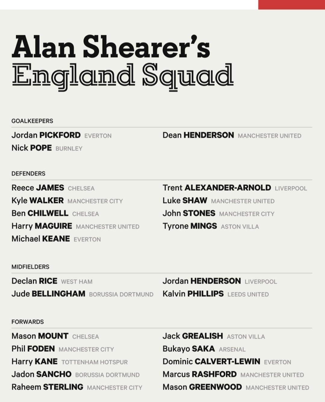 앨런 시어러가 뽑은 잉글랜드 유로 스쿼드