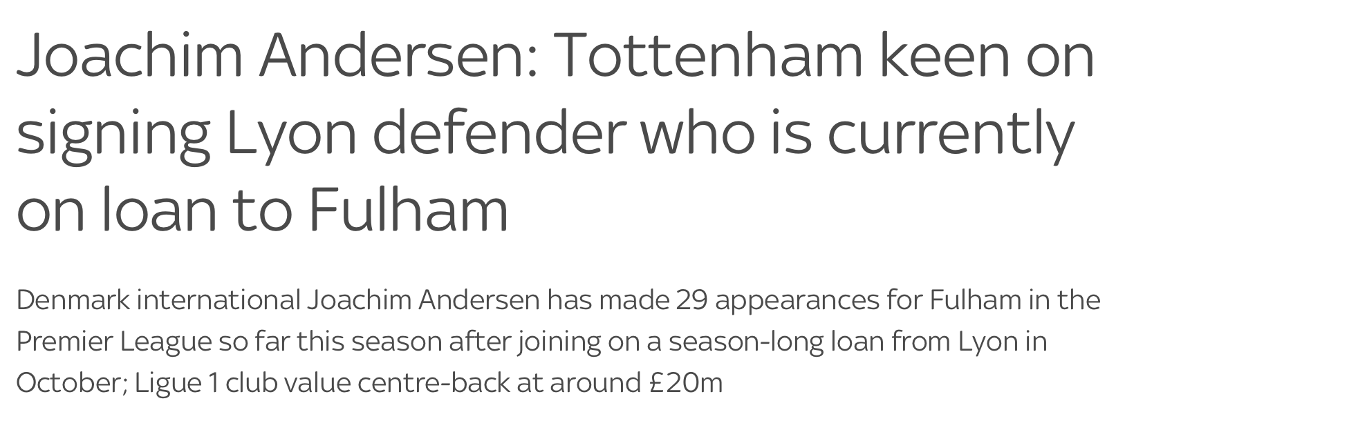 토트넘은 리옹에서 풀럼으로 임대와 있는 센터백 '요아킴 안데르센' 영입을 원함. 안데르센은 6월에 리옹으로 복귀 예정이지만 토트넘이 2천만 파운드를 충족한다면 다시 이적할 가능성이 있다.
