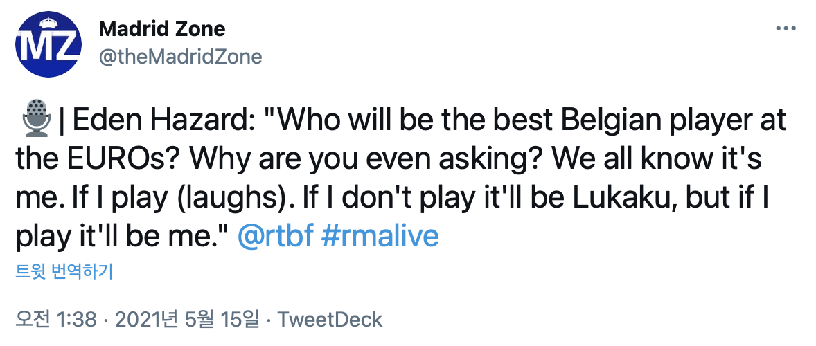 아자르 : 유로에 참가하는 최고의 선수가 누구냐고? 그걸 뭐하러 묻지? 모두가 알 듯이 나지. 만약 내가 뛴다면(웃음). 만약 내가 뛰지 않는다면 루카쿠. 그러나 내가 뛴다면 나지