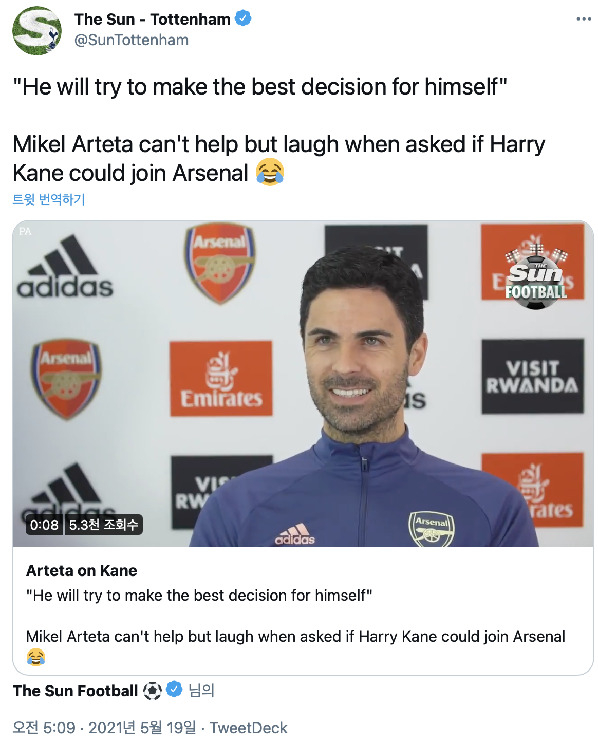 ["케인이 아스널로 온다면?" 짓궂은 질문을 받은 아르테타의 반응]