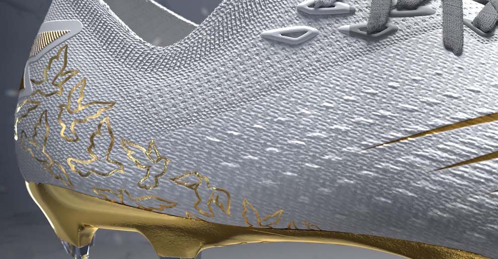 바로 스털링을 위해 제작한 ‘퓨론 V6’입니다. 스털링을 위한 첫 번째 시그니처 축구화는 화이트/골드 조합으로 고급스럽게 디자인 됐습니다.