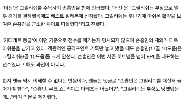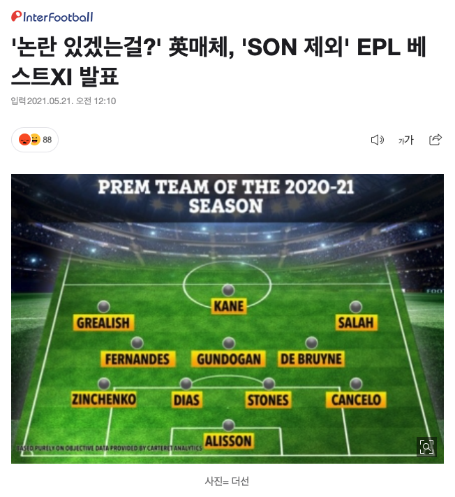 영국 매체, 손흥민 제외한 'EPL 베스트 11' 발표