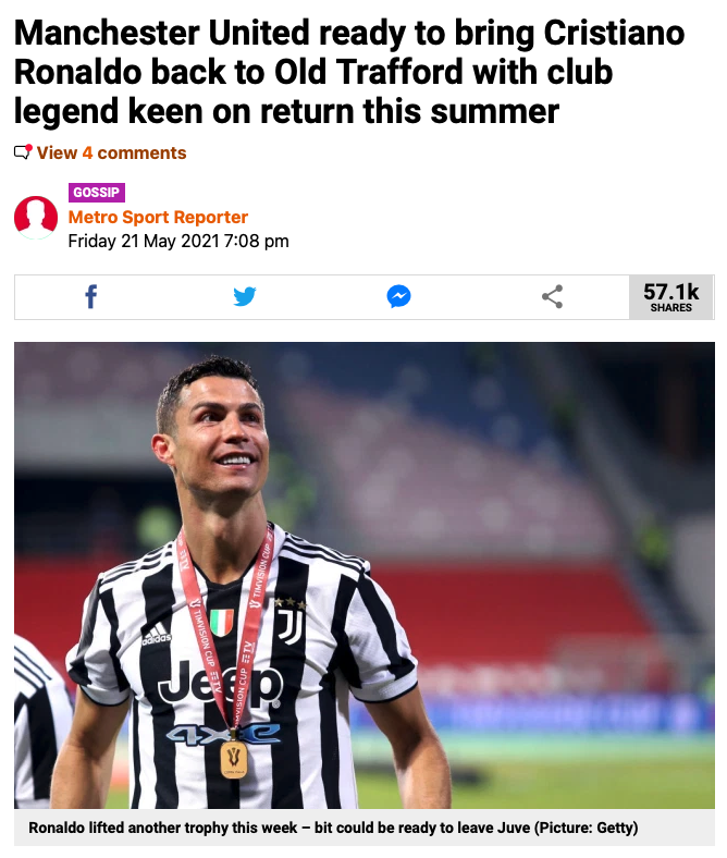 | [메트로] 호날두는 맨유 복귀를 진지하게 고민 중이다 | |