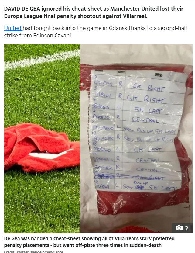 출처 : https://www.thesun.co.uk/sport/football/15087472/man-utd-de-gea-ignored-penalty-advice-villarreal/