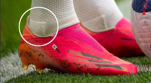 손흥민 선수는 복숭아뼈 아랫부분을 부드럽게 하기 위해 아디다스에게 특별한 커스텀을 요청했을 가능성이 있습니다. 엑스 고스티드+를 신는 다른 선수를 찾아보면 일반 판매 버전과 동일한 것을 신고 있는 것을 확인할 수 있습니다.