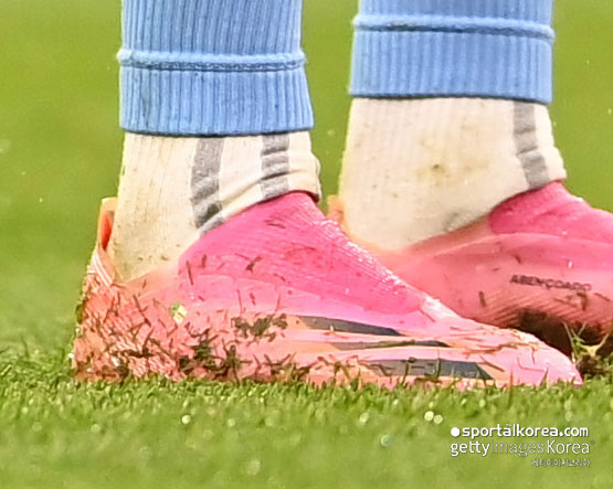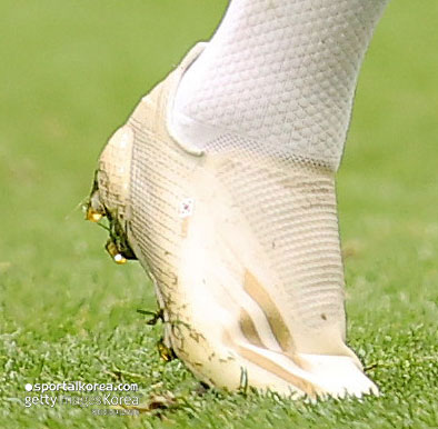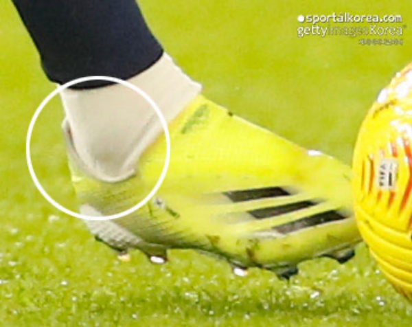 클로즈업한 손흥민 선수의 축구화입니다. 특이점이 보이시나요? 손흥민 선수의 엑스 고스티드+는 '복숭아뼈 아래 부분에 덧댐'이 되어 있는 것을 찾을 수 있습니다. 정확하게 보이진 않지만 스웨이드 혹은 인조 가죽인 것으로 보이는데요.