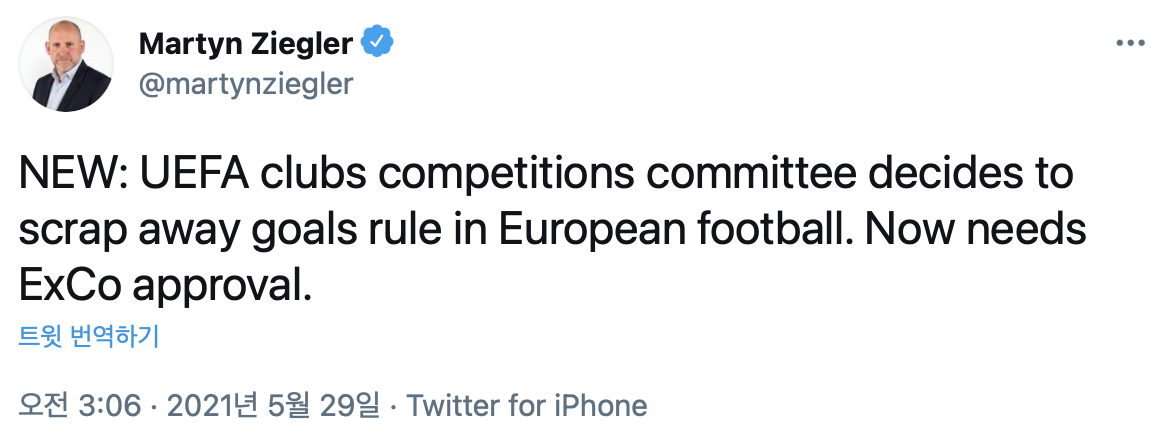 UEFA는 원정골(away goal) 제도의 폐지를 결정했다. ExCo의 승인을 기다리는 중.. (원정골이 주는 쾌감을 이젠 느낄 수 없는 건가..)