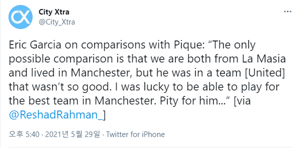 에릭 가르시아 "피케와 나의 공통점은 라마시아 출신이며 맨체스터에서 살았다는 것이다."