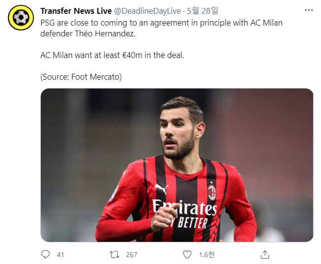 PSG는 AC밀란의 수비수 테오 에르난데스 영입에 원칙적 합의에 이르렀다. AC 밀란은 최소 40m유로를 원한다.