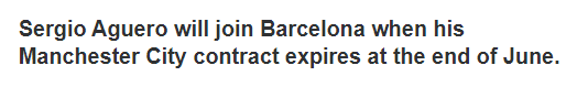 "세르히오 아구에로는 6월 맨시티와의 계약이 끝나고 바르셀로나에 합류합니다."