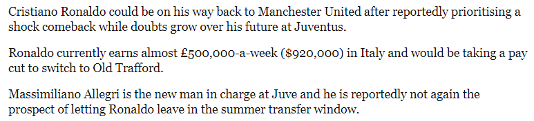 호날두는 이탈리아에서 현재 주급으로 거의 50만 파운드를 받고 있지만, 맨유 복귀를 위해 삭감을 받아들일 것이다.