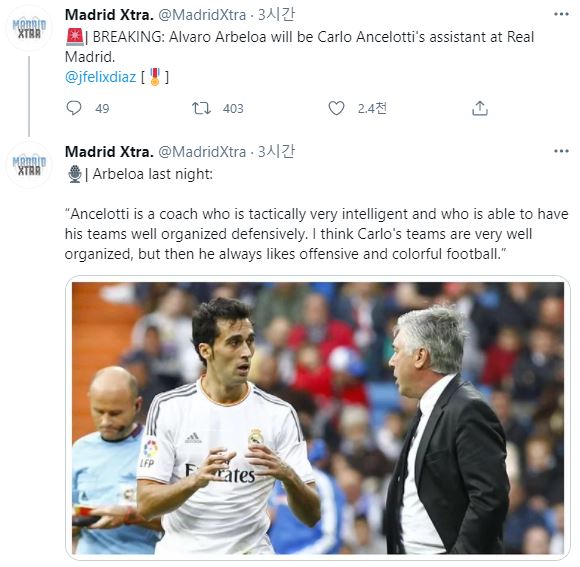 아르벨로아 : “Ancelotti는 전술적으로 매우 똑똑하고 팀을 수비 적으로 잘 조직 할 수있는 코치입니다. 나는 Carlo의 팀이 매우 잘 조직되어 있다고 생각하지만 그는 항상 공격적이고 화려한 축구를 좋아합니다.”